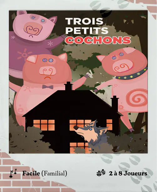 Petits et grands sont invités à explorer le domaine des trois petits cochons, pour résoudre des énigmes malicieuses et découvrir que, parfois, les contes cachent plus qu’ils ne disent.